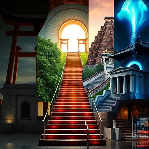Одним из ярчайших примеров является лестница Иакова в библейской традиции, символизирующая связь между небом и землёй. В Месопотамии зиккураты с их многослойными платформами воплощали идею приближения к божеству. В индийском храмовом архитектурном стиле лестницы ведут к святыням, обозначая путь к духовному просветлению. Также в даосизме лестницы могут символизировать этапы внутренней алхимии и перехода на новый уровень сознания.